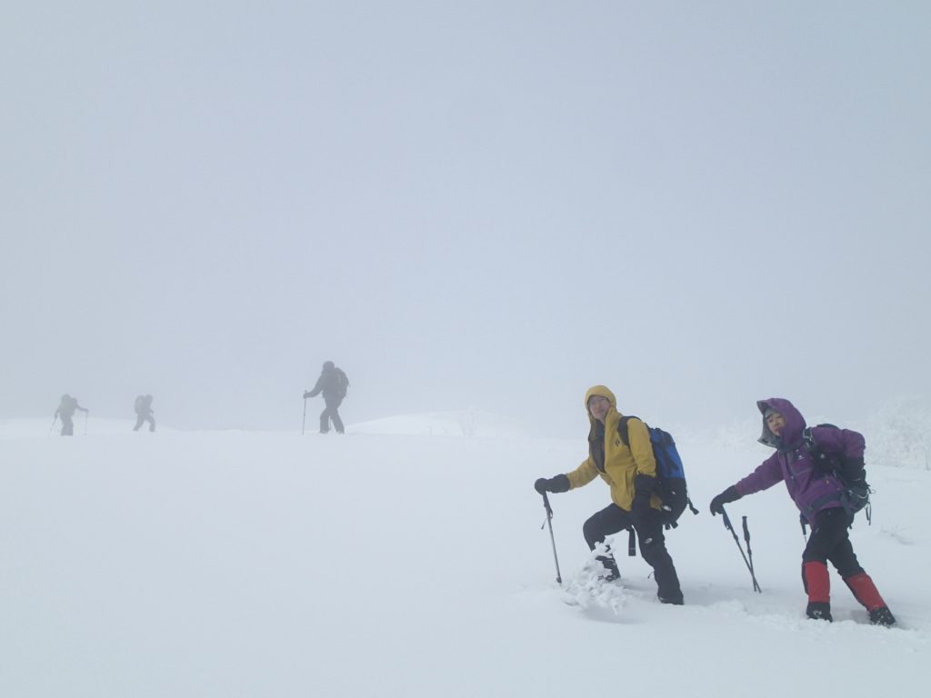 翌日は吾妻山へ。例年より雪は少なめででした。日帰りで登ってきたメンバーと合流し、昼は会長の地元の味、白味噌仕立ての雑煮を食べました。